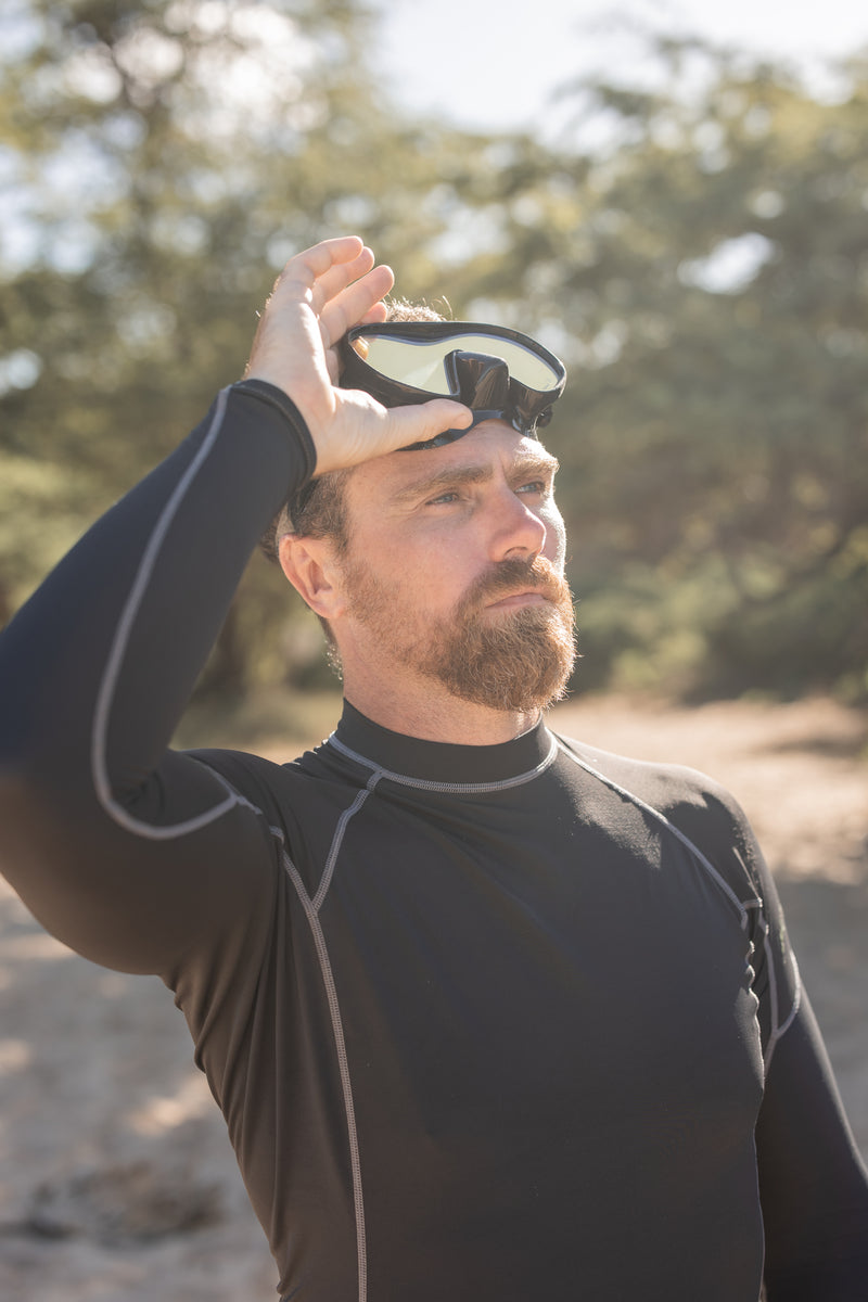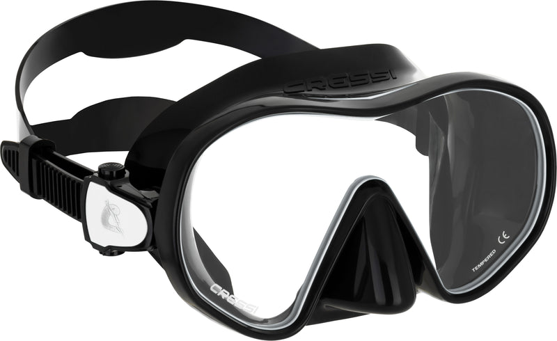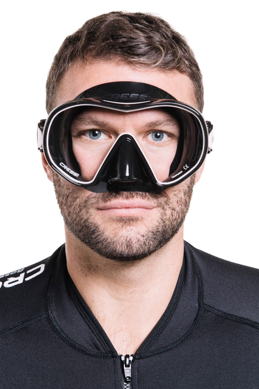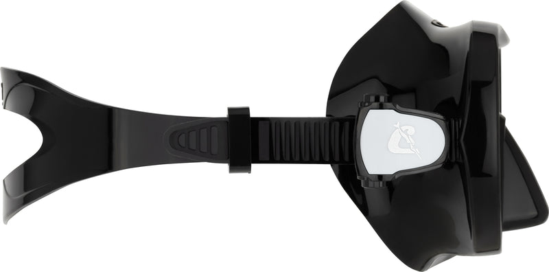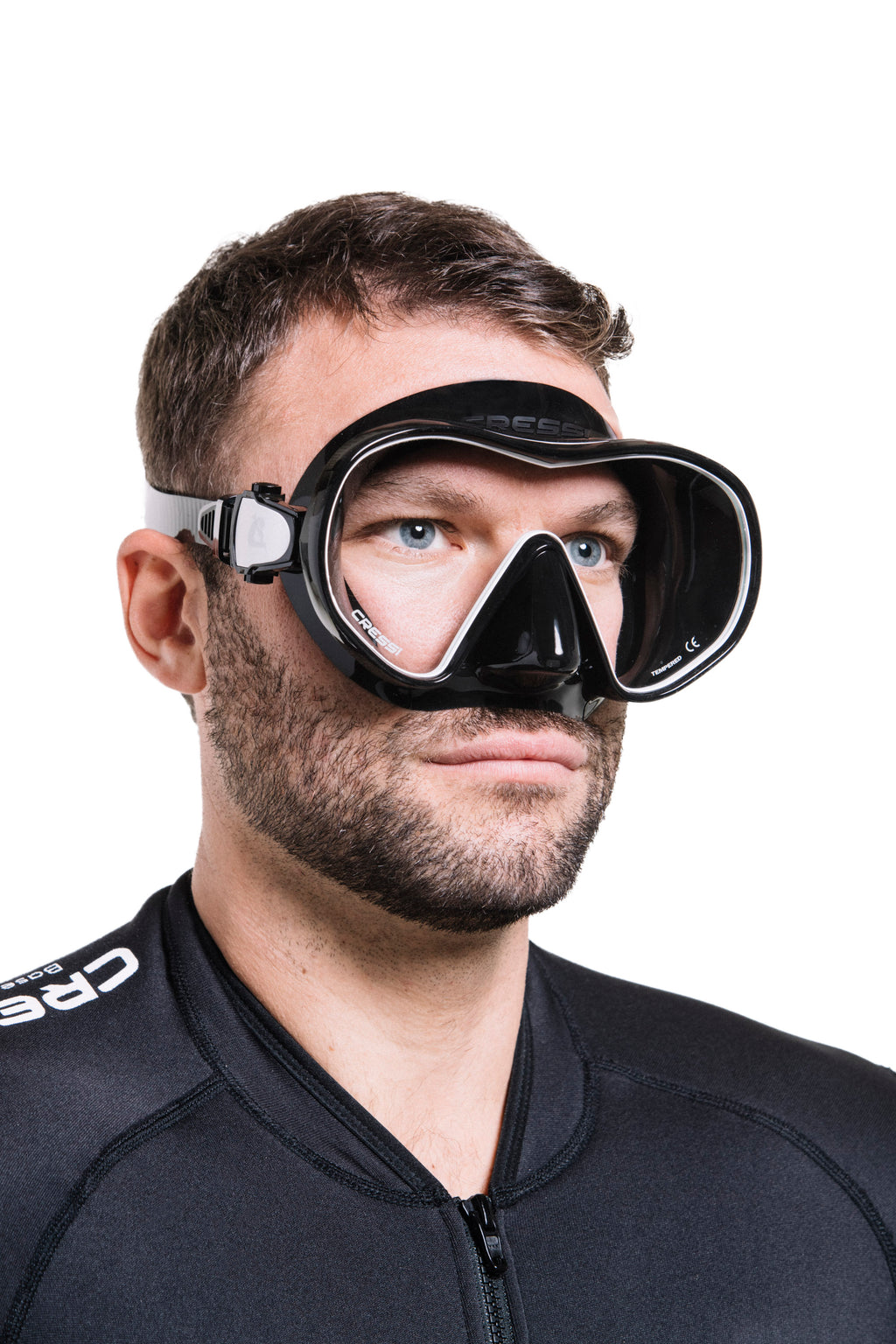 La F-Dual es una máscara de un solo lente que presenta un conjunto único de lente y faldón sin montura. El diseño de la máscara une un faldón de silicona de alto grado con borde de doble pluma directamente a una sola lente de vidrio templado para lograr lo último en simplicidad. El facial de silicona se monta directamente sobre el cristal sin necesidad de marco. Este sistema garantiza una buena visibilidad en todas las direcciones. El volumen interno bajo permite un despeje sin esfuerzo y las hebillas de las correas de ajuste rápido están moldeadas directamente en la falda para un ajuste flexible y una resistencia reducida. La máscara F-Dual tiene un diseño de correa dividida ancha para mayor comodidad y para dar una tensión uniforme en la falda para un sellado adecuado.
