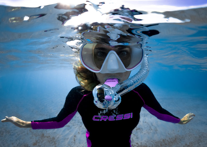 El Supernova Dry es uno de los mejores snorkels secos disponibles en el mercado. Tiene un exclusivo Splash Guard en la parte superior que reduce en gran medida la entrada de agua durante el uso en la superficie. La válvula especial en la parte superior sella el tubo mientras buceas, impidiendo casi por completo la entrada de agua cuando el snorkel está sumergido. La parte final tiene una pieza corrugada que es lisa en el lado interior y mantiene el tubo alejado de la boca durante el uso cuando se bucea. Un pozo especial de recogida de agua, con una gran válvula elíptica, permite una rápida y fácil expulsión del agua. La boquilla en ángulo reemplazable y la sección del tubo corrugado están hechos de silicona hipoalergénica, lo que agrega comodidad y funcionalidad. Un protector de esnórquel de liberación rápida y una forma ergonómicamente contorneada hacen de este un excelente esnórquel.