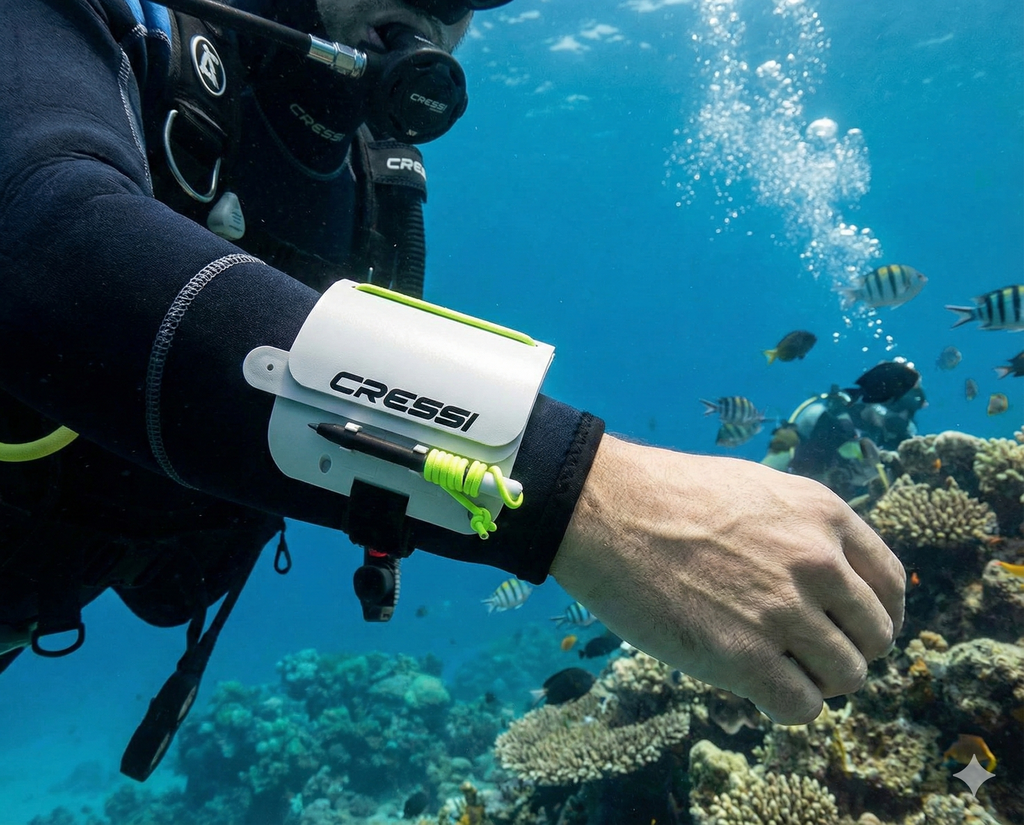 La multipizarra para muñeca con lapiz es ideal para buceo técnico o instructores, para mejorar la comunicación del grupo.