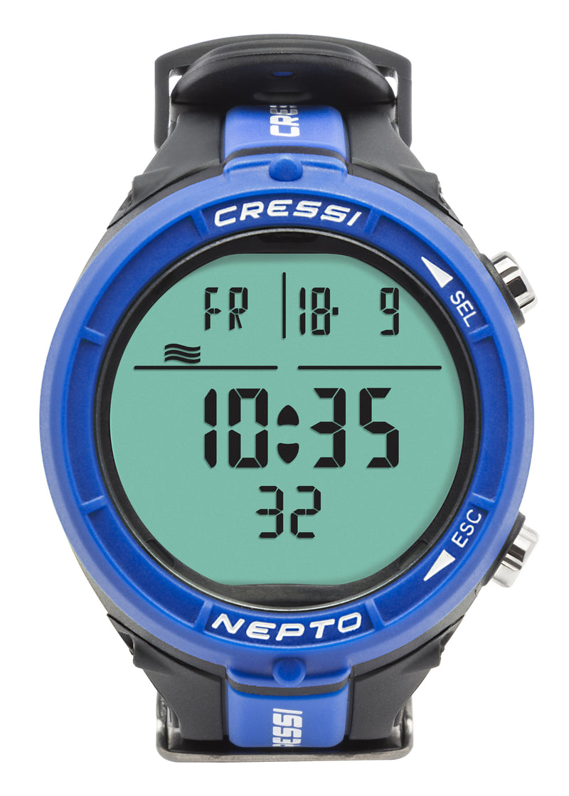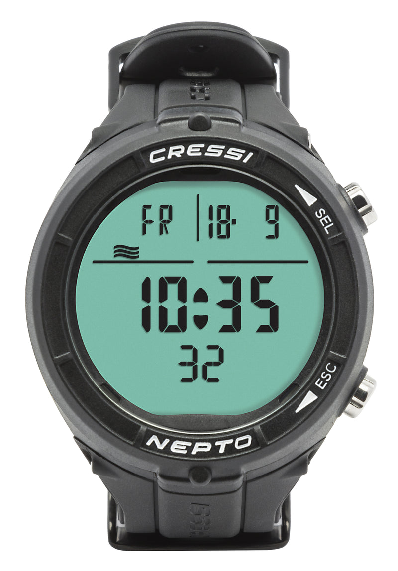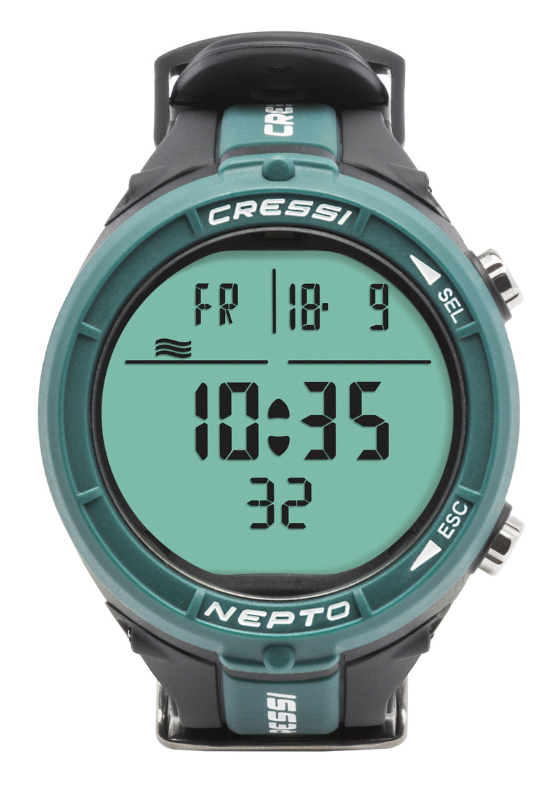 Esto garantiza un control de calidad riguroso y un servicio de atención a los clientes que respalda la fiabilidad de cada unidad. Aunque tiene la apariencia de un reloj moderno y atractivo, el NEPTO alberga un software avanzado diseñado específicamente para apnea. Desarrollado en estrecha colaboración con el equipo de Cressi, el programa proporciona un acceso ágil e intuitivo a la información clave durante tus inmersiones.
